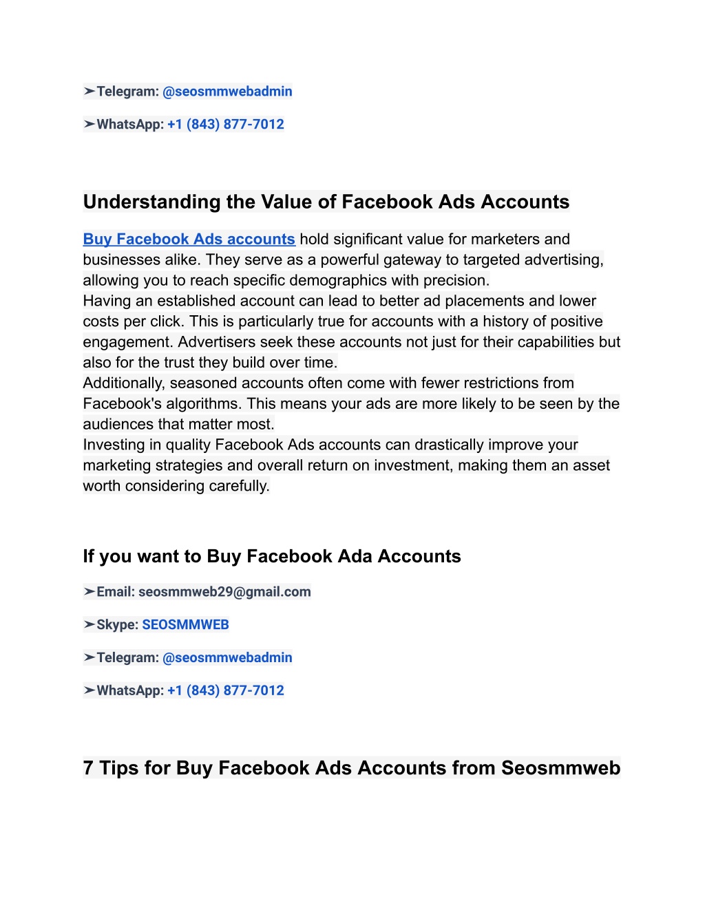 Tips for Choosing the Right Site When looking to buy Facebook Ads accounts, the choice of site is crucial. Start by checking reviews and testimonials from previous buyers. A trustworthy platform will often have positive feedback. Next, assess their customer support. Reliable sites should offer responsive assistance for any queries you may have during your purchase process. Security measures are also vital. Confirm that the site uses encryption and secure payment methods to protect your personal information. Look for transparency in pricing too. Avoid platforms with hidden fees or vague costs associated with account purchases. Consider their return policy. A good site will allow you some flexibility if things don't go as planned after purchase, ensuring peace of mind throughout the transaction. If you want to Buy Facebook Ada Accounts ➤Email: seosmmweb29@gmail.com ➤Skype: SEOSMMWEB ➤Telegram: @seosmmwebadmin ➤WhatsApp: +1 (843) 877-7012 Conclusion When considering the purchase of Facebook Ads accounts, it’s essential to prioritize safety and reliability. The digital marketing landscape is constantly evolving, making it crucial to stay informed about where and how you invest your resources. By exploring the top platforms highlighted in this article, you