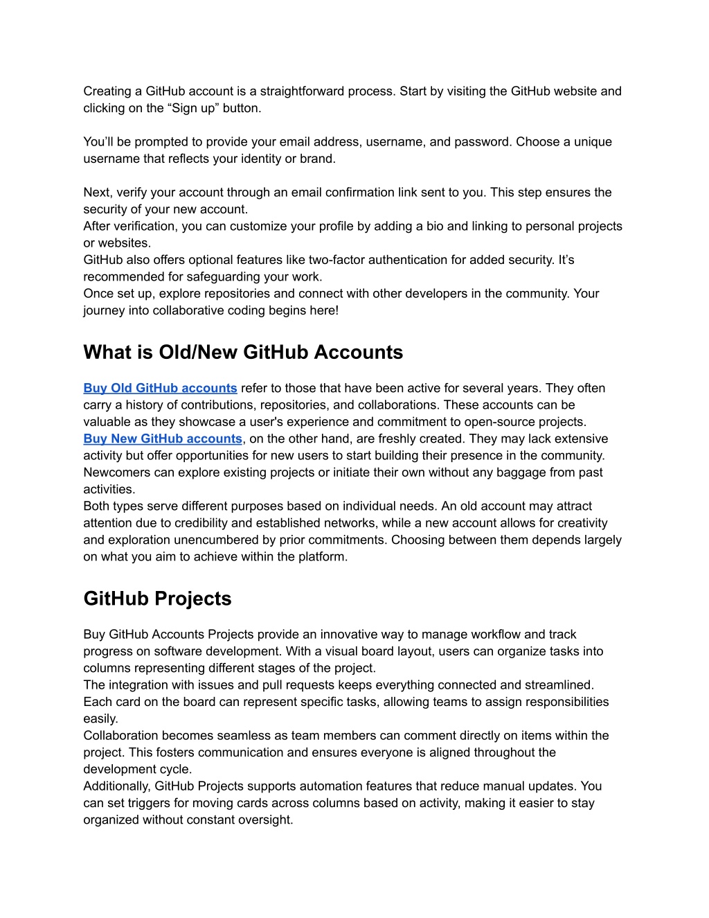 Creating a GitHub account is a straightforward process. Start by visiting the GitHub website and clicking on the “Sign up” button. You’ll be prompted to provide your email address, username, and password. Choose a unique username that reflects your identity or brand. Next, verify your account through an email confirmation link sent to you. This step ensures the security of your new account. After verification, you can customize your profile by adding a bio and linking to personal projects or websites. GitHub also offers optional features like two-factor authentication for added security. It’s recommended for safeguarding your work. Once set up, explore repositories and connect with other developers in the community. Your journey into collaborative coding begins here! What is Old/New GitHub Accounts Buy Old GitHub accounts refer to those that have been active for several years. They often carry a history of contributions, repositories, and collaborations. These accounts can be valuable as they showcase a user's experience and commitment to open-source projects. Buy New GitHub accounts, on the other hand, are freshly created. They may lack extensive activity but offer opportunities for new users to start building their presence in the community. Newcomers can explore existing projects or initiate their own without any baggage from past activities. Both types serve different purposes based on individual needs. An old account may attract attention due to credibility and established networks, while a new account allows for creativity and exploration unencumbered by prior commitments. Choosing between them depends largely on what you aim to achieve within the platform. GitHub Projects Buy GitHub Accounts Projects provide an innovative way to manage workflow and track progress on software development. With a visual board layout, users can organize tasks into columns representing different stages of the project. The integration with issues and pull requests keeps everything connected and streamlined. Each card on the board can represent specific tasks, allowing teams to assign responsibilities easily. Collaboration becomes seamless as team members can comment directly on items within the project. This fosters communication and ensures everyone is aligned throughout the development cycle. Additionally, GitHub Projects supports automation features that reduce manual updates. You can set triggers for moving cards across columns based on activity, making it easier to stay organized without constant oversight.