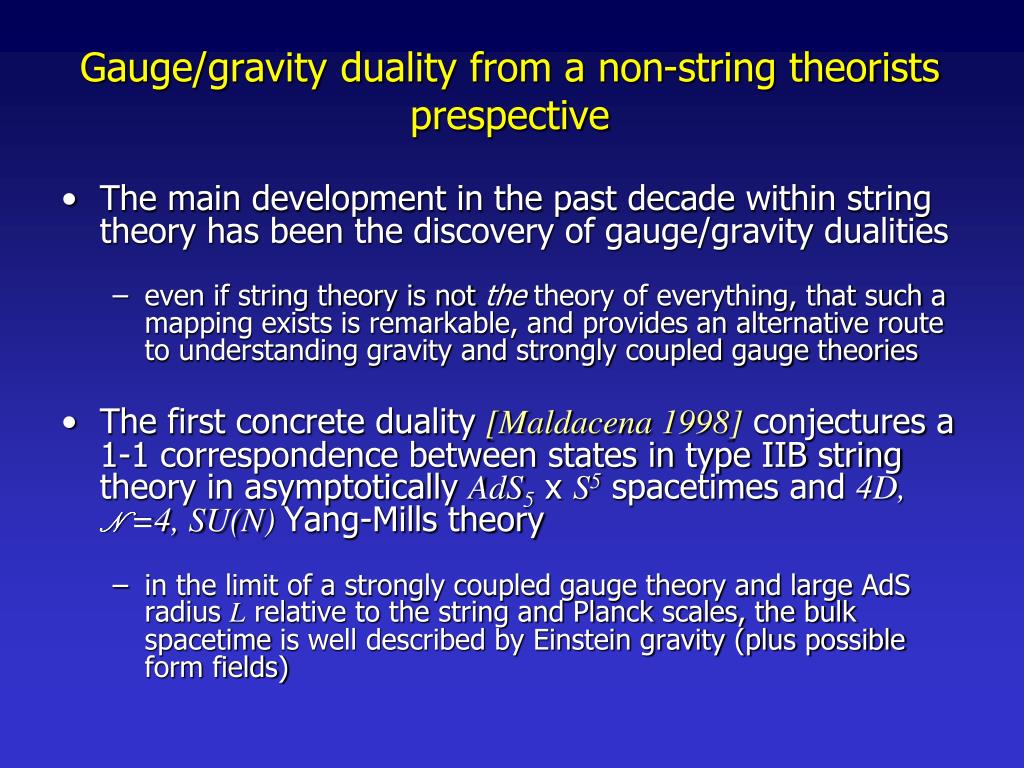 Gauge/gravity duality from a non-string theorists prespective • The main development in the past decade within string theory has been the discovery of gauge/gravity dualities • even if string theory is not the theory of everything, that such a mapping exists is remarkable, and provides an alternative route to understanding gravity and strongly coupled gauge theories • The first concrete duality [Maldacena 1998] conjectures a 1-1 correspondence between states in type IIB string theory in asymptotically AdS5 x S5spacetimes and 4D, N =4, SU(N) Yang-Mills theory • in the limit of a strongly coupled gauge theory and large AdS radius L relative to the string and Planck scales, the bulk spacetime is well described by Einstein gravity (plus possible form fields)