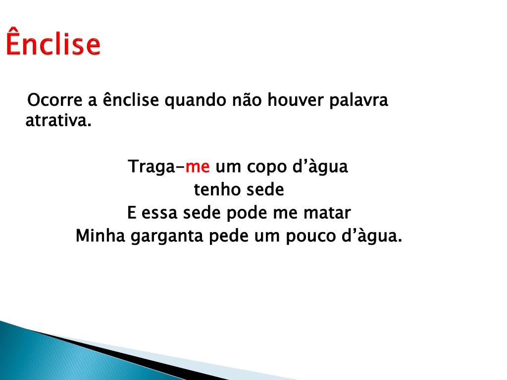 Ênclise Ocorre a ênclise quando não houver palavra atrativa. Traga-me um copo d’àgua tenho sede E essa sede pode me matar Minha garganta pede um pouco d’àgua.
