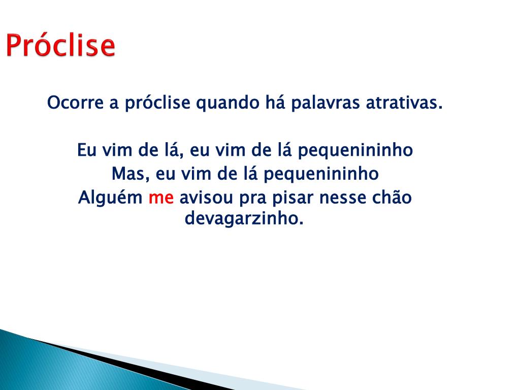 Próclise Ocorre a próclise quando há palavras atrativas. Eu vim de lá, eu vim de lá pequenininho Mas, eu vim de lá pequenininho Alguém me avisou pra pisar nesse chão devagarzinho.