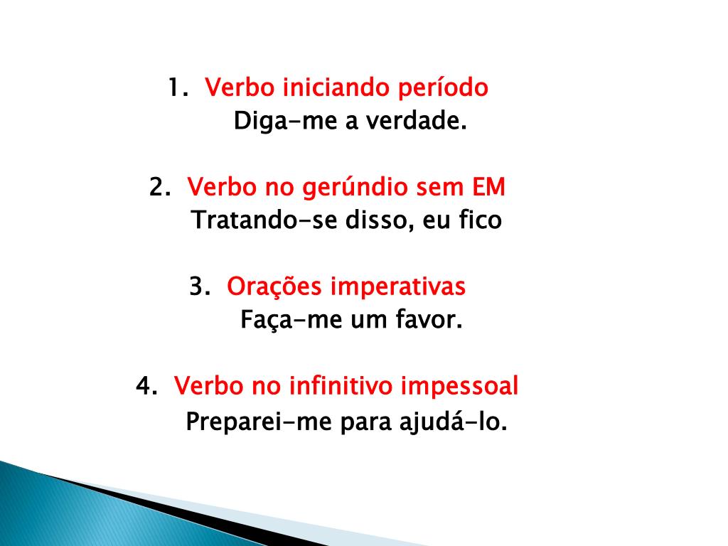 1.Verbo iniciando período Diga-me a verdade. 2.Verbo no gerúndio sem EM Tratando-se disso, eu fico 3.Orações imperativas Faça-me um favor. 4. Verbo no infinitivo impessoal Preparei-me para ajudá-lo.
