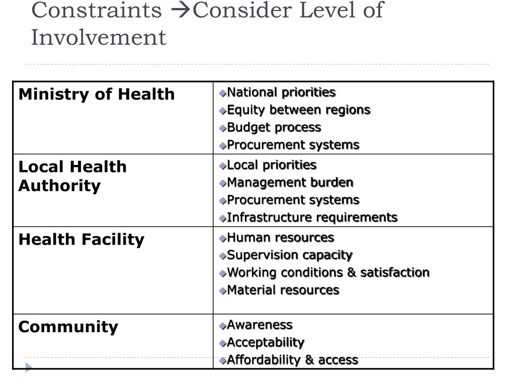 Who to engage? • Whose policy is it? • Who defines the problems & priorities? • Consider role of researchers, clinicians, managers, donors, advocates • Usually differs by health system level, domestic vs. international • Careful of frequent changes
