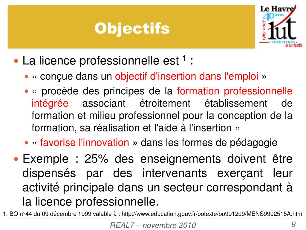 Objectifs 1. BO n°44 du 09 décembre 1999 valable à : http://www.education.gouv.fr/botexte/bo991209/MENS9902515A.htm • La licence professionnelle est 1 : • « conçue dans un objectif d'insertion dans l'emploi » • « procède des principes de la formation professionnelle intégrée associant étroitement établissement de formation et milieu professionnel pour la conception de la formation, sa réalisation et l'aide à l'insertion » • « favorise l'innovation » dans les formes de pédagogie • Exemple : 25% des enseignements doivent être dispensés par des intervenants exerçant leur activité principale dans un secteur correspondant à la licence professionnelle.