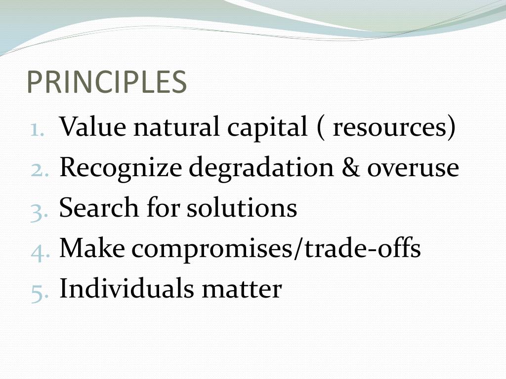 PRINCIPLES • Value natural capital ( resources) • Recognize degradation & overuse • Search for solutions • Make compromises/trade-offs • Individuals matter