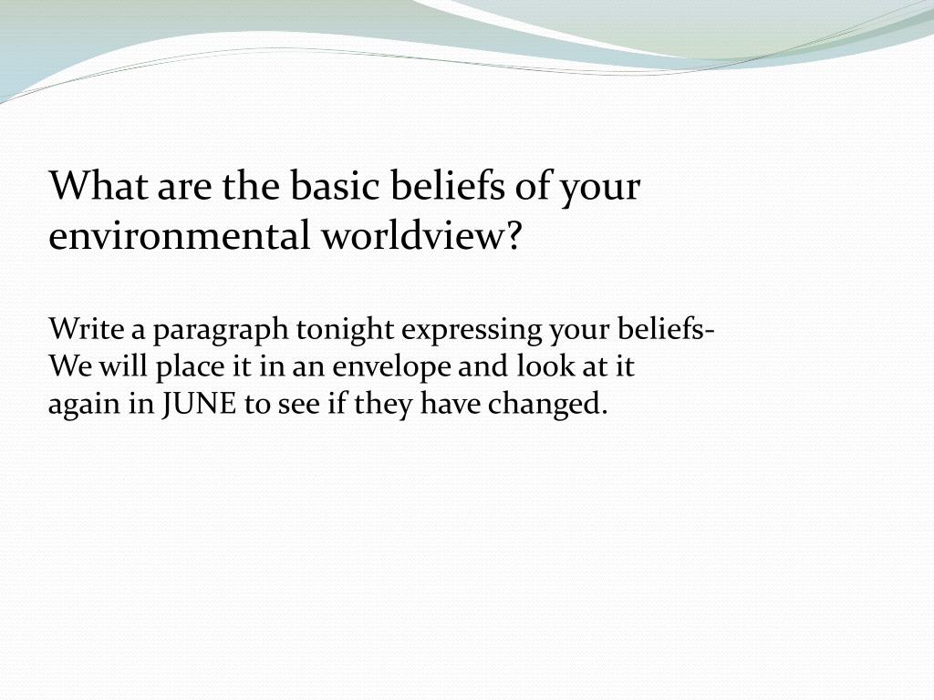 What are the basic beliefs of your environmental worldview? Write a paragraph tonight expressing your beliefs- We will place it in an envelope and look at it again in JUNE to see if they have changed.