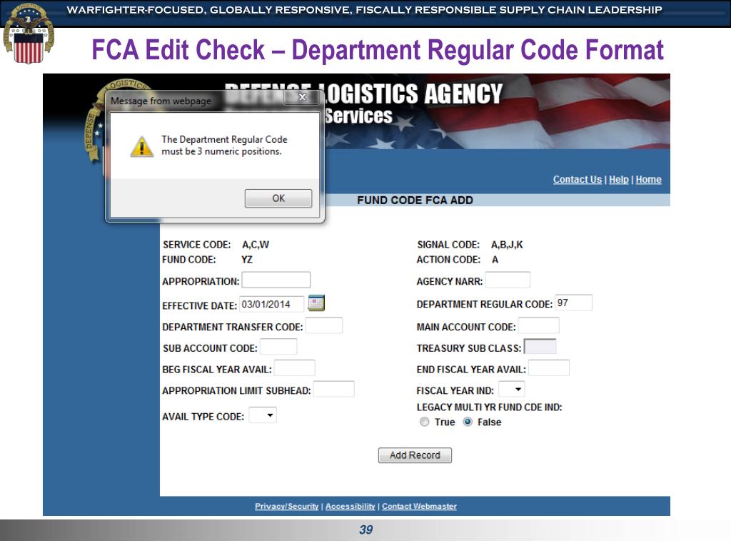 Purpose • Facilitate legacy and future processes • Support Treasury Account Symbol (TAS) & SFIS/SLOA; add key data elements to SFIS Fund Code to Fund Account Conversion Table • Enhance edits to improve financial processes; improve audit readiness • Facilitate real time update of fund codes by Fund Code Monitors • Allow for staging fund codes for future effective dates • Replace email distribution of fund code updates with system-to-system synchronization