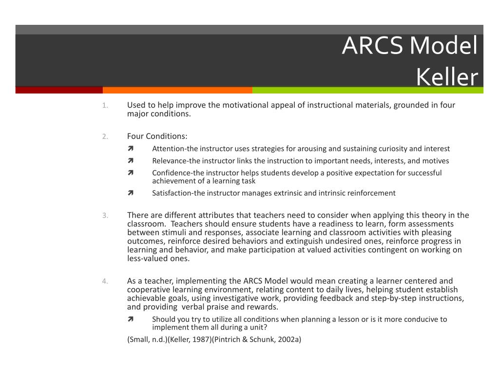 ARCS ModelKeller • Used to help improve the motivational appeal of instructional materials, grounded in four major conditions. • Four Conditions: • Attention-the instructor uses strategies for arousing and sustaining curiosity and interest • Relevance-the instructor links the instruction to important needs, interests, and motives • Confidence-the instructor helps students develop a positive expectation for successful achievement of a learning task • Satisfaction-the instructor manages extrinsic and intrinsic reinforcement • There are different attributes that teachers need to consider when applying this theory in the classroom. Teachers should ensure students have a readiness to learn, form assessments between stimuli and responses, associate learning and classroom activities with pleasing outcomes, reinforce desired behaviors and extinguish undesired ones, reinforce progress in learning and behavior, and make participation at valued activities contingent on working on less-valued ones. • As a teacher, implementing the ARCS Model would mean creating a learner centered and cooperative learning environment, relating content to daily lives, helping student establish achievable goals, using investigative work, providing feedback and step-by-step instructions, and providing verbal praise and rewards. • Should you try to utilize all conditions when planning a lesson or is it more conducive to implement them all during a unit? (Small, n.d.)(Keller, 1987)(Pintrich & Schunk, 2002a)