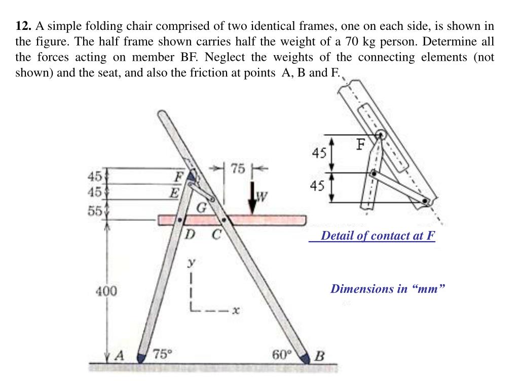 12. A simple folding chair comprised of two identical frames, one on each side, is shown in the figure. The half frame shown carries half the weight of a 70 kg person. Determine all the forces acting on member BF. Neglect the weights of the connecting elements (not shown) and the seat, and also the friction at points A, B and F. Detail of contact at F Dimensions in “mm”