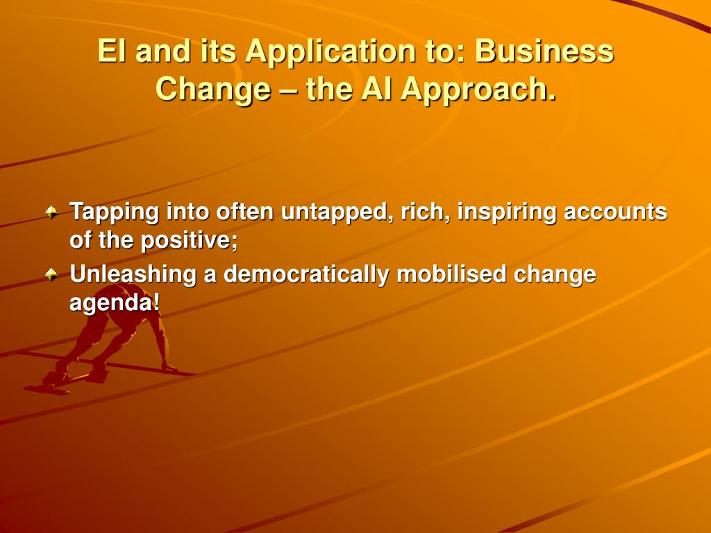 EI and its Application to: Business Change – the AI Approach. • Tapping into often untapped, rich, inspiring accounts of the positive; • Unleashing a democratically mobilised change agenda!