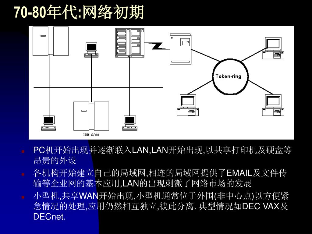 70-80年代:网络初期 • PC机开始出现并逐渐联入LAN,LAN开始出现,以共享打印机及硬盘等昂贵的外设 • 各机构开始建立自己的局域网,相连的局域网提供了EMAIL及文件传输等企业网的基本应用,LAN的出现刺激了网络市场的发展 • 小型机,共享WAN开始出现,小型机通常位于外围(非中心点)以方便紧急情况的处理,应用仍然相互独立,彼此分离. 典型情况如DEC VAX及DECnet.