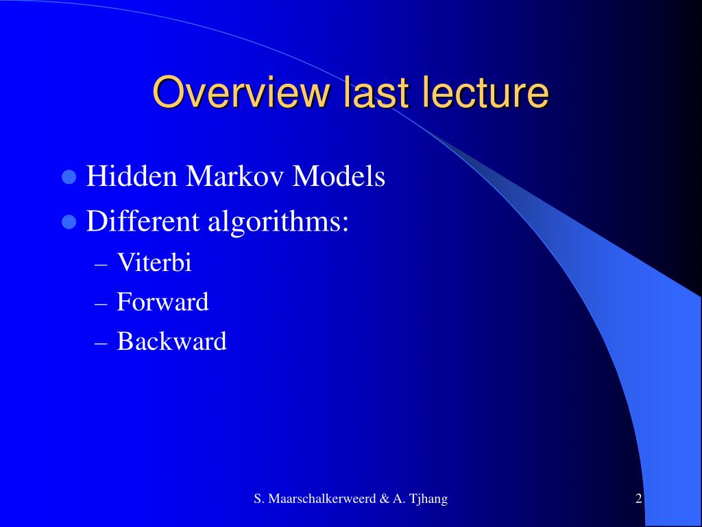 Overview last lecture • Hidden Markov Models • Different algorithms: • Viterbi • Forward • Backward S. Maarschalkerweerd & A. Tjhang