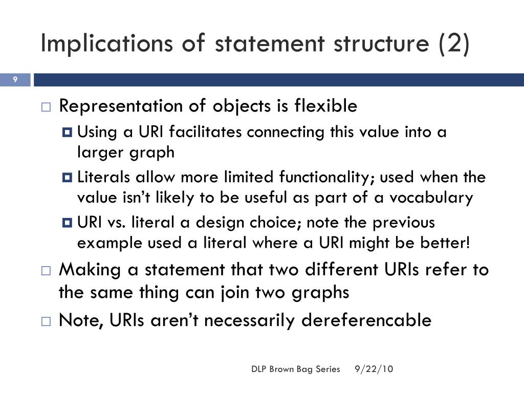 Implications of statement structure (2) • Representation of objects is flexible • Using a URI facilitates connecting this value into a larger graph • Literals allow more limited functionality; used when the value isn’t likely to be useful as part of a vocabulary • URI vs. literal a design choice; note the previous example used a literal where a URI might be better! • Making a statement that two different URIs refer to the same thing can join two graphs • Note, URIs aren’t necessarily dereferencable DLP Brown Bag Series