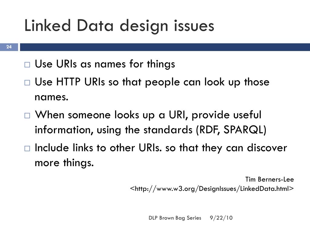 Linked Data design issues • Use URIs as names for things • Use HTTP URIs so that people can look up those names. • When someone looks up a URI, provide useful information, using the standards (RDF, SPARQL) • Include links to other URIs. so that they can discover more things. Tim Berners-Lee<http://www.w3.org/DesignIssues/LinkedData.html> DLP Brown Bag Series