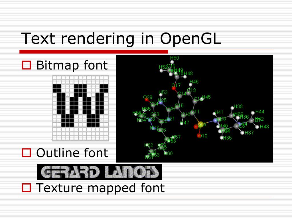 Text rendering in OpenGL • Bitmap font • Outline font • Texture mapped font