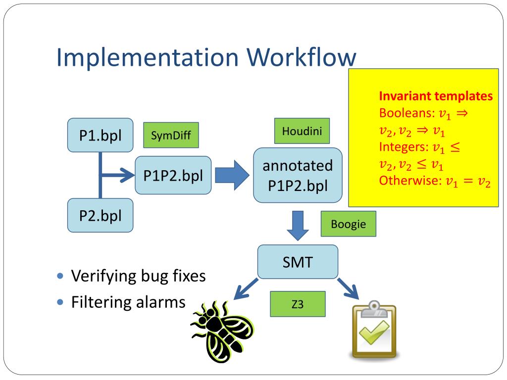 Implementation Workflow • Invariant templates • Booleans: • Integers: • Otherwise: • Verifying bug fixes • Filtering alarms P1.bpl Houdini SymDiff annotated P1P2.bpl P1P2.bpl P2.bpl Boogie SMT Z3