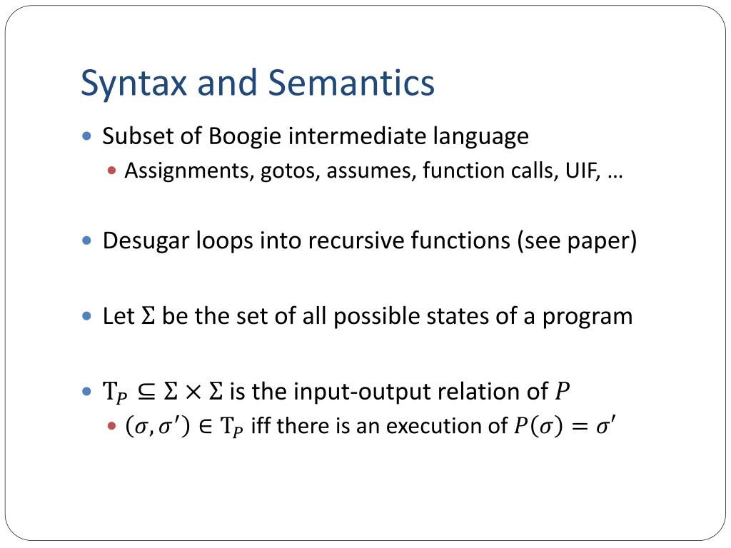 Syntax and Semantics • Subset of Boogie intermediate language • Assignments, gotos, assumes, function calls, UIF, … • Desugar loops into recursive functions (see paper) • Let be the set of all possible states of a program • is the input-output relation of • iff there is an execution of