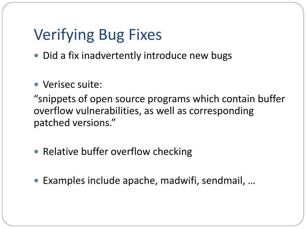 Verifying Bug Fixes • Did a fix inadvertently introduce new bugs • Verisecsuite: “snippets of open source programs which contain buffer overflow vulnerabilities, as well as corresponding patched versions.” • Relative buffer overflow checking • Examples include apache, madwifi, sendmail, …