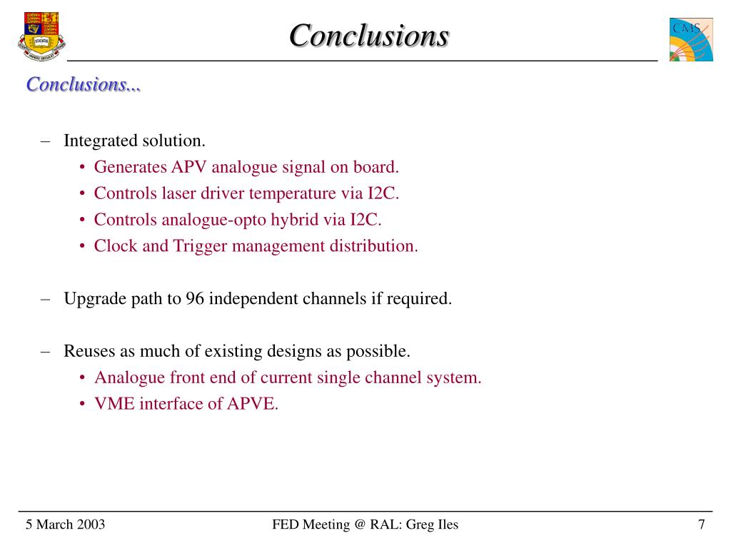 Conclusions... Integrated solution. Generates APV analogue signal on board. Controls laser driver temperature via I2C. Controls analogue-opto hybrid via I2C. Clock and Trigger management distribution. Upgrade path to 96 independent channels if required. Reuses as much of existing designs as possible. Analogue front end of current single channel system. VME interface of APVE. Conclusions FED Meeting @ RAL: Greg Iles