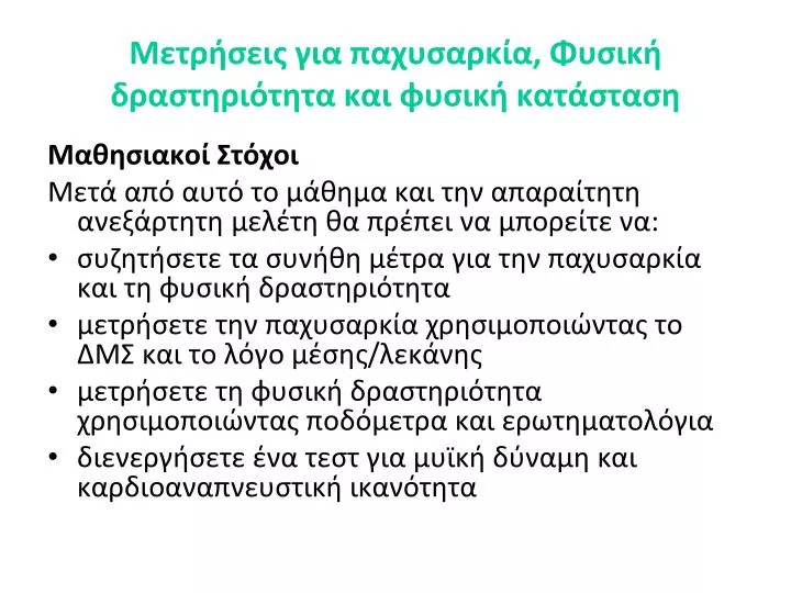 Μετρήσεις για παχυσαρκία, Φυσική δραστηριότητα και φυσική κατάσταση. Μαθησιακοί Στόχοι Μετά από αυτό το μάθημα και την απαραίτητη ανεξάρτητη μελέτη θα πρέπει να μπορείτε να: συζητήσετε τα συνήθη μέτρα για την παχυσαρκία και τη φυσική δραστηριότητα