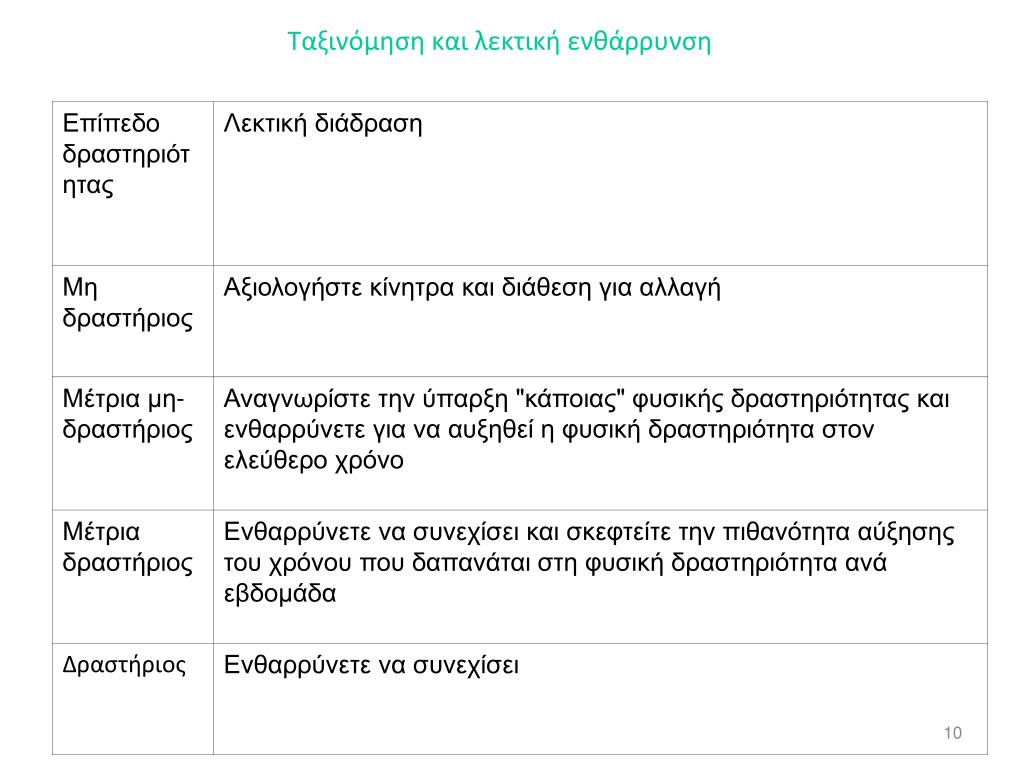 General Practice PhysicalActivity Questionnaire (GP PA Q) Η παρέμβαση για φυσική δραστηριότητα θα πρέπει να βασίζεται στη συζήτηση με τον ασθενή και θα πρέπει οι επιλογές που θα κάνει να είναι κατόπιν ενημέρωσης. Μια μέθοδος να βοηθήσουμε στην αλλαγή συμπεριφοράς είναι η συνέντευξη για παροχή κινήτρων Σε μερικά λεπτά μπορείς να ενθαρρύνεις έναν ασθενή να σκεφτεί γιατί και πώς θα μπορούσε να αλλάξει τη φυσική δραστηριότητα χωρίς να αισθανθεί ότι πιέζεται να ξεκινήσει κάτι για το οποίο δεν ειναι έτοιμος Ένα παράδειγμα μιας τέτοιας συνέντευξης ακολουθεί για αυτούς που κατηγοριοποιούνται ως μη-δραστήριοι. Αυτοί θα βγουν οι πιο κερδισμένοι από τη φυσική δραστηριότητα