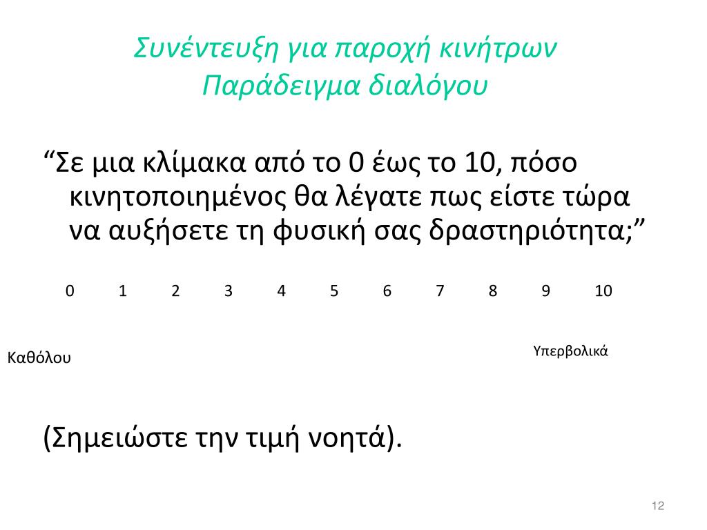 Συνέντευξη για παροχή κινήτρων Παράδειγμα διαλόγου “Σε μια κλίμακα από το 0 έως το 10, πόσο κινητοποιημένος θα λέγατε πως είστε τώρα να αυξήσετε τη φυσική σας δραστηριότητα;” (Σημειώστε την τιμή νοητά). Υπερβολικά Καθόλου