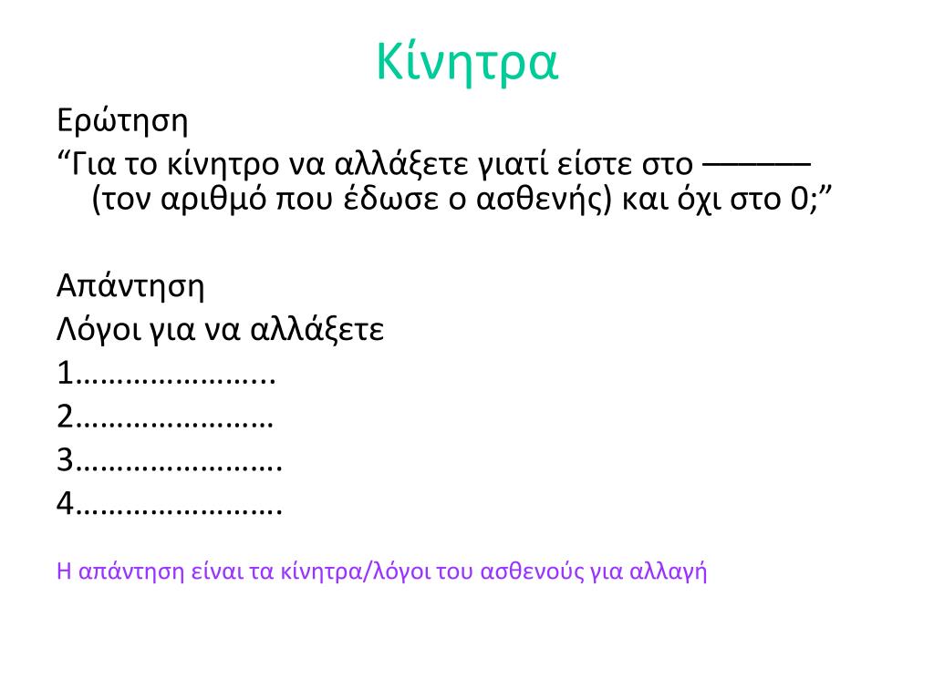 Κίνητρα Ερώτηση “Για το κίνητρο να αλλάξετε γιατί είστε στο –––––– (τον αριθμό που έδωσε ο ασθενής) και όχι στο 0;” Aπάντηση Λόγοι για να αλλάξετε 1…………………... 2…………………… 3……………………. 4……………………. Η απάντηση είναι τα κίνητρα/λόγοι του ασθενούς για αλλαγή