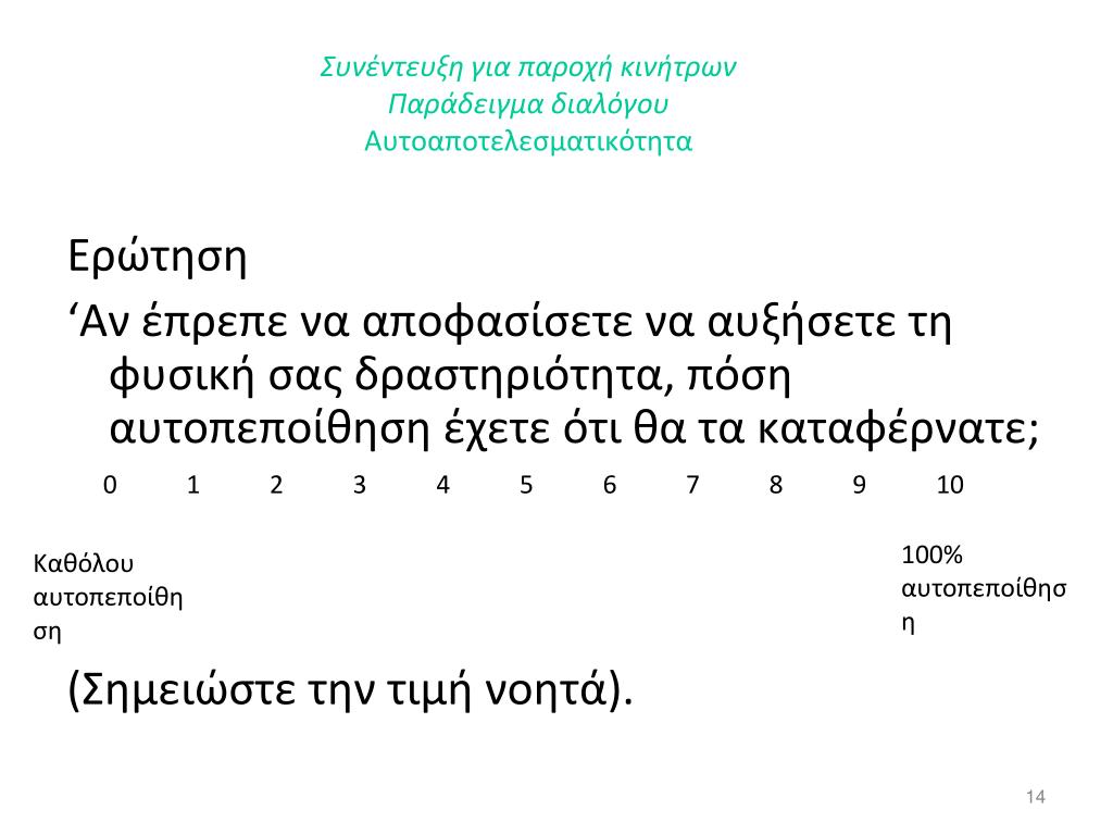 Συνέντευξη για παροχή κινήτρων Παράδειγμα διαλόγουΑυτοαποτελεσματικότητα Ερώτηση ‘Αν έπρεπε να αποφασίσετε να αυξήσετε τη φυσική σας δραστηριότητα, πόση αυτοπεποίθηση έχετε ότι θα τα καταφέρνατε; (Σημειώστε την τιμή νοητά). 100% αυτοπεποίθηση Καθόλου αυτοπεποίθηση