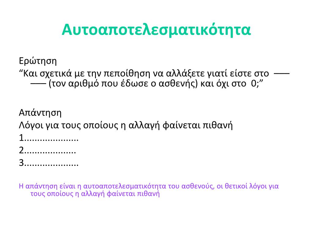 Αυτοαποτελεσματικότητα Ερώτηση “Και σχετικά με την πεποίθηση να αλλάξετε γιατί είστε στο –––––– (τον αριθμό που έδωσε ο ασθενής) και όχι στο 0;” Aπάντηση Λόγοι για τους οποίους η αλλαγή φαίνεται πιθανή 1..................... 2.................... 3..................... Η απάντηση είναι η αυτοαποτελεσματικότητα του ασθενούς, οι θετικοί λόγοι για τους οποίους η αλλαγή φαίνεται πιθανή