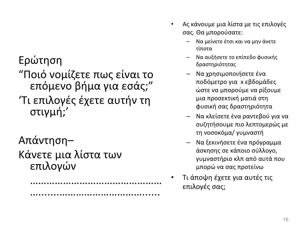 Ερώτηση “Ποιό νομίζετε πως είναι το επόμενο βήμα για εσάς;” ‘Τι επιλογές έχετε αυτήν τη στιγμή;’ Aπάντηση– Κάνετε μια λίστα των επιλογών …………………………………………….......…………………………...... Ας κάνουμε μια λίστα με τις επιλογές σας. Θα μπορούσατε: Να μείνετε έτσι και να μην άνετε τίποτα Να αυξήσετε το επίπεδο φυσικής δραστηριότητας Να χρησιμοποιήσετε ένα ποδόμετρο για x εβδομάδες ώστε να μπορούμε να ρίξουμε μια προσεκτική ματιά στη φυσική σας δραστηριότητα Να κλείσετε ένα ραντεβού για να συζητήσουμε πιο λεπτομερώς με τη νοσοκόμα/ γυμναστή Να ξεκινήσετε ένα πρόγραμμα άσκησης σε κάποιο σύλλογο, γυμναστήριο κλπ από αυτά που μπορώ να σας προτείνω Τι άποψη έχετε για αυτές τις επιλογές σας;
