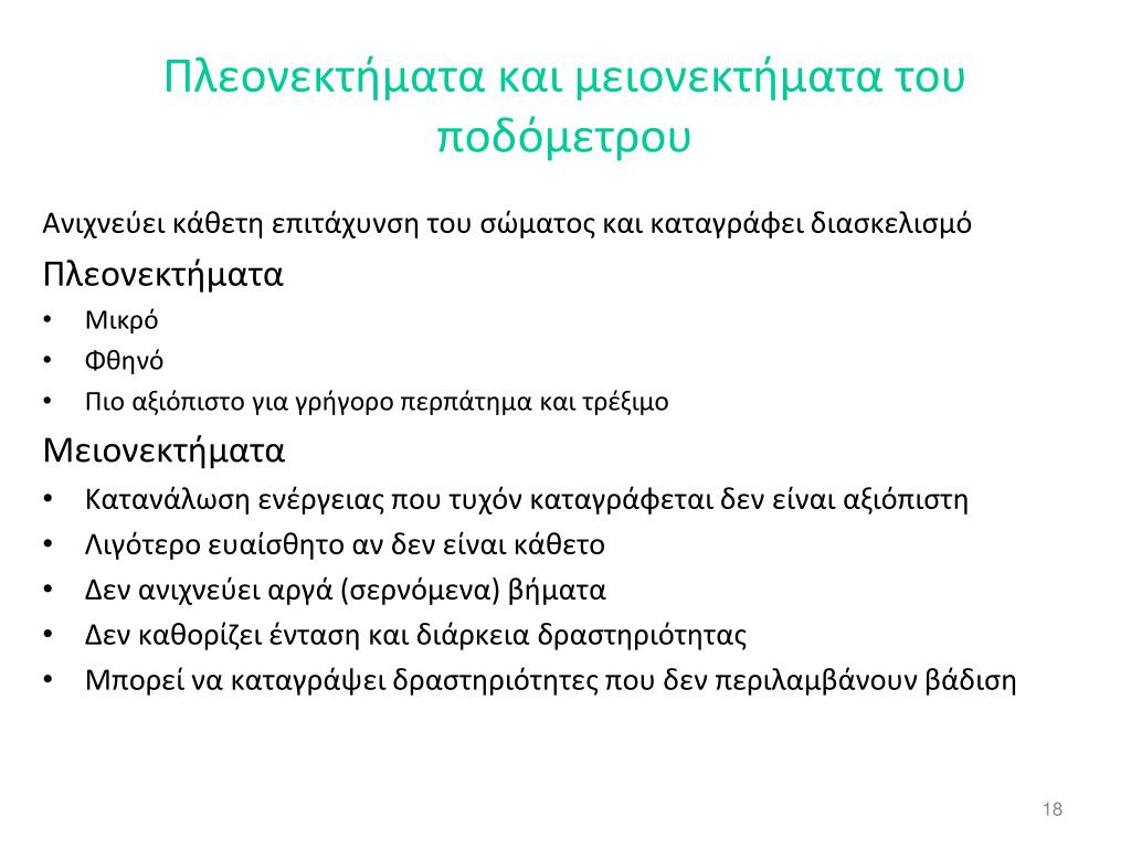 Πλεονεκτήματα και μειονεκτήματα του ποδόμετρου Ανιχνεύει κάθετη επιτάχυνση του σώματος και καταγράφει διασκελισμό Πλεονεκτήματα Μικρό Φθηνό Πιο αξιόπιστο για γρήγορο περπάτημα και τρέξιμο Μειονεκτήματα Κατανάλωση ενέργειας που τυχόν καταγράφεται δεν είναι αξιόπιστη Λιγότερο ευαίσθητο αν δεν είναι κάθετο Δεν ανιχνεύει αργά (σερνόμενα) βήματα Δεν καθορίζει ένταση και διάρκεια δραστηριότητας Μπορεί να καταγράψει δραστηριότητες που δεν περιλαμβάνουν βάδιση