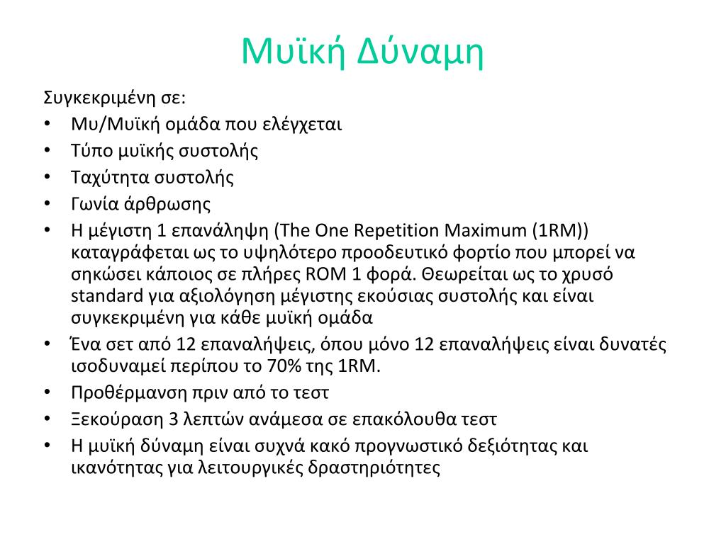 Μυϊκή Δύναμη Συγκεκριμένη σε: Μυ/Μυϊκή ομάδα που ελέγχεται Τύπο μυϊκής συστολής Ταχύτητα συστολής Γωνία άρθρωσης Η μέγιστη 1 επανάληψη (The One Repetition Maximum (1RM)) καταγράφεται ως το υψηλότερο προοδευτικό φορτίο που μπορεί να σηκώσει κάποιος σε πλήρες ROM 1 φορά. Θεωρείται ως το χρυσό standard για αξιολόγηση μέγιστης εκούσιας συστολής και είναι συγκεκριμένη για κάθε μυϊκή ομάδα Ένα σετ από 12 επαναλήψεις, όπου μόνο 12 επαναλήψεις είναι δυνατές ισοδυναμεί περίπου το 70% της 1RM. Προθέρμανση πριν από το τεστ Ξεκούραση 3 λεπτών ανάμεσα σε επακόλουθα τεστ Η μυϊκή δύναμη είναι συχνά κακό προγνωστικό δεξιότητας και ικανότητας για λειτουργικές δραστηριότητες