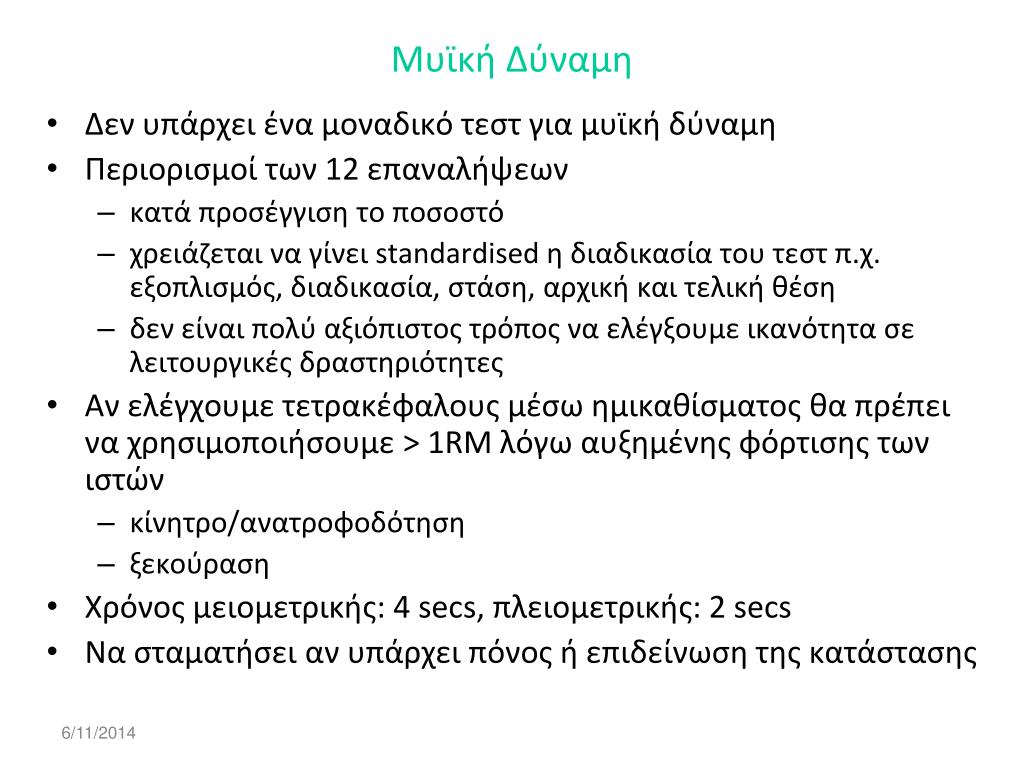 Μυϊκή Δύναμη • Δεν υπάρχει ένα μοναδικό τεστ για μυϊκή δύναμη • Περιορισμοί των 12 επαναλήψεων • κατά προσέγγιση το ποσοστό • χρειάζεται να γίνει standardised η διαδικασία του τεστ π.χ. εξοπλισμός, διαδικασία, στάση, αρχική και τελική θέση • δεν είναι πολύ αξιόπιστος τρόπος να ελέγξουμε ικανότητα σε λειτουργικές δραστηριότητες • Αν ελέγχουμε τετρακέφαλους μέσω ημικαθίσματος θα πρέπει να χρησιμοποιήσουμε > 1RM λόγω αυξημένης φόρτισης των ιστών • κίνητρο/ανατροφοδότηση • ξεκούραση • Χρόνος μειομετρικής: 4 secs, πλειομετρικής: 2 secs • Να σταματήσει αν υπάρχει πόνος ή επιδείνωση της κατάστασης