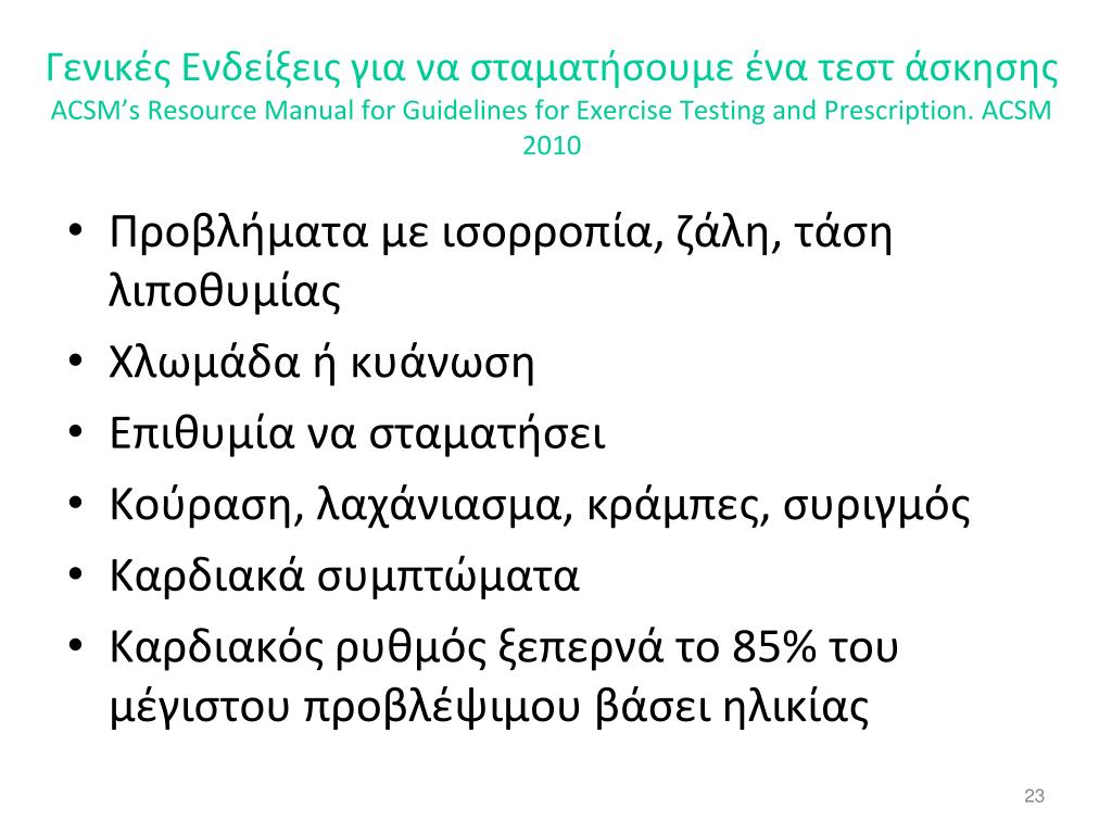 Γενικές Ενδείξεις για να σταματήσουμε ένα τεστ άσκησηςACSM’s Resource Manual for Guidelines for Exercise Testing and Prescription. ACSM 2010 Προβλήματα με ισορροπία, ζάλη, τάση λιποθυμίας Χλωμάδα ή κυάνωση Επιθυμία να σταματήσει Κούραση, λαχάνιασμα, κράμπες, συριγμός Καρδιακά συμπτώματα Καρδιακός ρυθμός ξεπερνά το 85% του μέγιστου προβλέψιμου βάσει ηλικίας