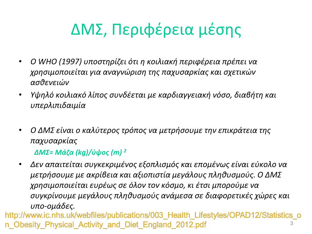ΔΜΣ, Περιφέρεια μέσης Ο WHO (1997) υποστηρίζει ότι η κοιλιακή περιφέρεια πρέπει να χρησιμοποιείται για αναγνώριση της παχυσαρκίας και σχετικών ασθενειών Υψηλό κοιλιακό λίπος συνδέεται με καρδιαγγειακή νόσο, διαβήτη και υπερλιπιδαιμία Ο ΔΜΣ είναι ο καλύτερος τρόπος να μετρήσουμε την επικράτεια της παχυσαρκίας ΔΜΣ= Μάζα (kg)/ύψος (m) 2 Δεν απαιτείται συγκεκριμένος εξοπλισμός και επομένως είναι εύκολο να μετρήσουμε με ακρίβεια και αξιοπιστία μεγάλους πληθυσμούς. Ο ΔΜΣ χρησιμοποιείται ευρέως σε όλον τον κόσμο, κι έτσι μπορούμε να συγκρίνουμε μεγάλους πληθυσμούς ανάμεσα σε διαφορετικές χώρες και υπο-ομάδες.