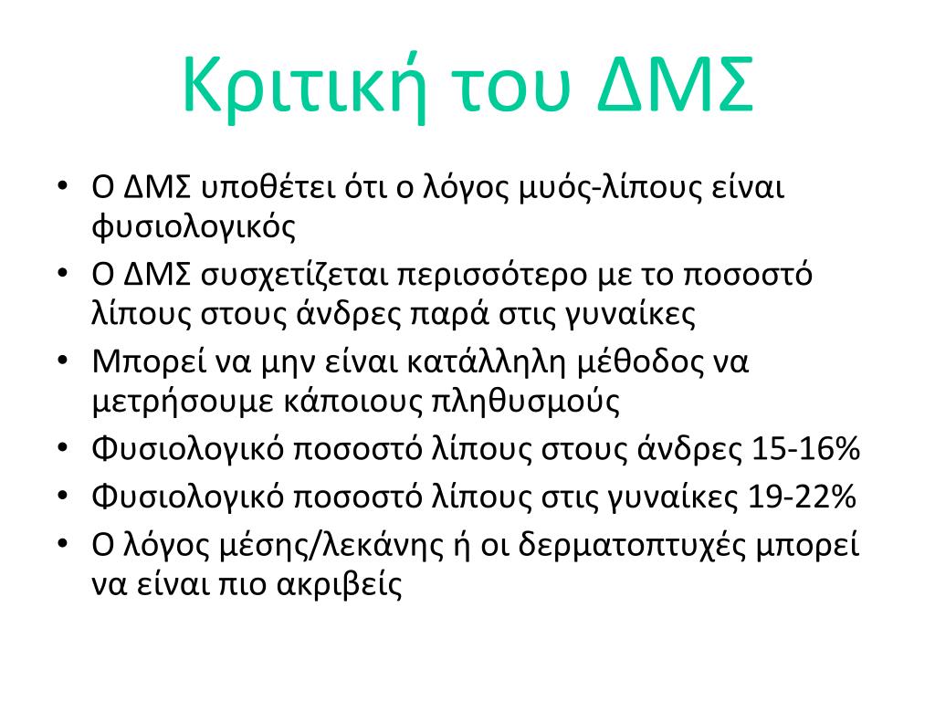Κριτική του ΔΜΣ Ο ΔΜΣ υποθέτει ότι ο λόγος μυός-λίπους είναι φυσιολογικός Ο ΔΜΣ συσχετίζεται περισσότερο με το ποσοστό λίπους στους άνδρες παρά στις γυναίκες Μπορεί να μην είναι κατάλληλη μέθοδος να μετρήσουμε κάποιους πληθυσμούς Φυσιολογικό ποσοστό λίπους στους άνδρες 15-16% Φυσιολογικό ποσοστό λίπους στις γυναίκες 19-22% Ο λόγος μέσης/λεκάνης ή οι δερματοπτυχές μπορεί να είναι πιο ακριβείς