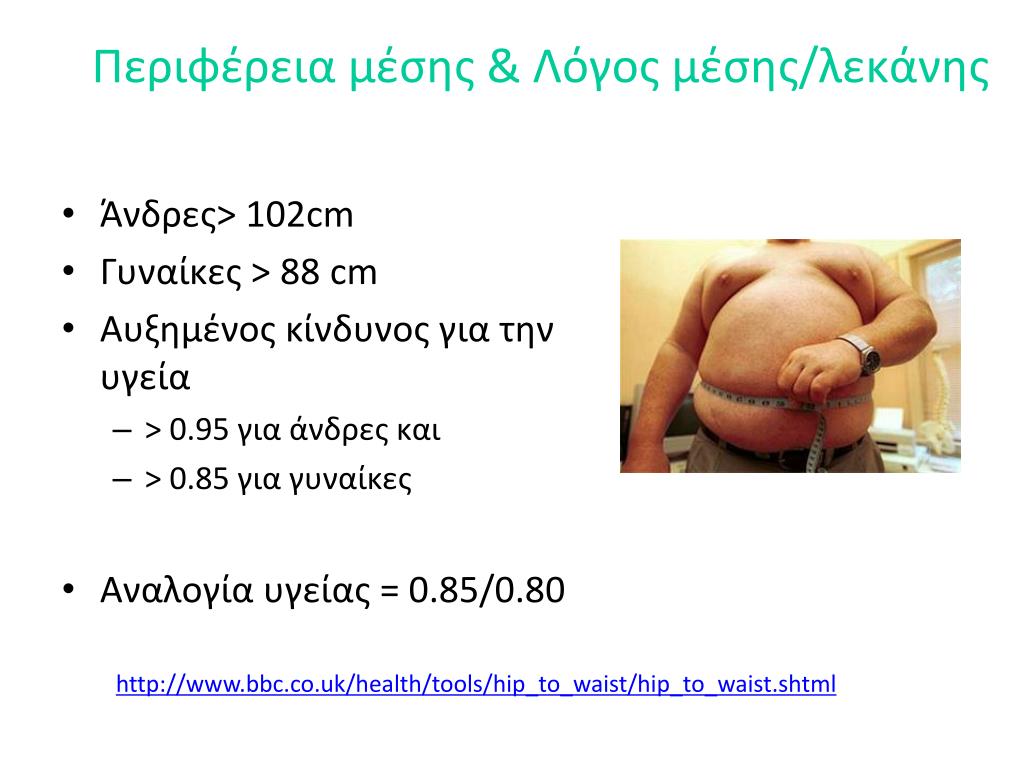 Περιφέρεια μέσης & Λόγος μέσης/λεκάνης http://www.bbc.co.uk/health/tools/hip_to_waist/hip_to_waist.shtml • Άνδρες> 102cm • Γυναίκες > 88 cm • Αυξημένος κίνδυνος για την υγεία • > 0.95 για άνδρες και • > 0.85 για γυναίκες • Αναλογία υγείας = 0.85/0.80