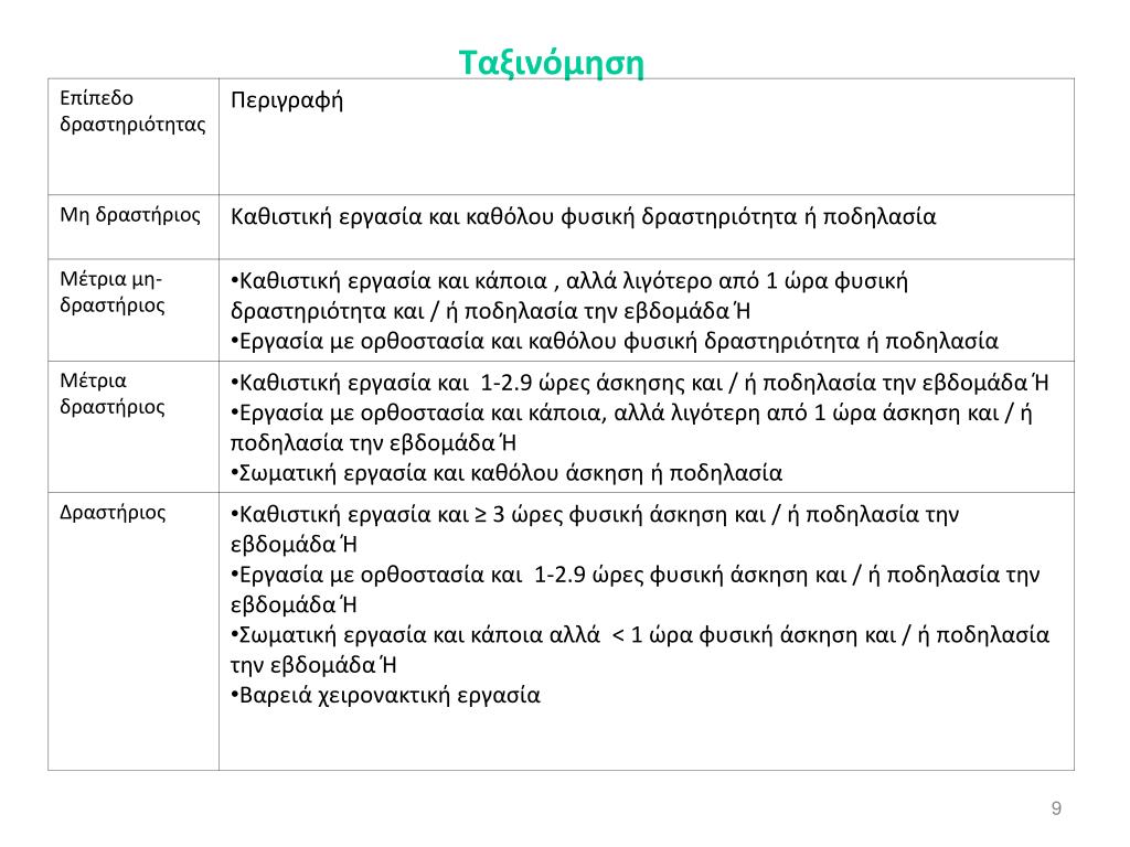 General Practice PhysicalActivity Questionnaire (GPPAQ) Το 2002 Το Υπουργείο Υγείας (UK) προσέλαβε ερευνητές για την παραγωγή μιας μίνι μέτρησης της φυσικής δραστηριότητας Η μέτρηση επρόκειτο να χρησιμοποιηθεί στην γενική πρακτική και ο σκοπός της ήταν να βγει ένας απλός δείκτης 4 επιπέδων για τη φυσική δραστηριότητα που θα αντικατόπτριζε το τρέχον επίπεδο φυσικής δραστηριότητας ενός ατόμου Ο δείκτης επρόκειτο να χρησιμοποιηθεί για να αποφασιστεί το πότε θα πρέπει να παρέμβουμε για να αυξήσουμε τη φυσική δραστηριότητα.