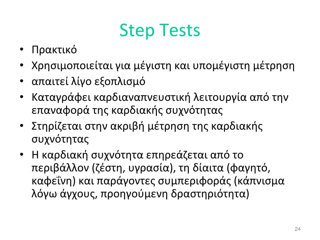 Step Tests Πρακτικό Χρησιμοποιείται για μέγιστη και υπομέγιστη μέτρηση απαιτεί λίγο εξοπλισμό Καταγράφει καρδιαναπνευστική λειτουργία από την επαναφορά της καρδιακής συχνότητας Στηρίζεται στην ακριβή μέτρηση της καρδιακής συχνότητας Η καρδιακή συχνότητα επηρεάζεται από το περιβάλλον (ζέστη, υγρασία), τη δίαιτα (φαγητό, καφεΐνη) και παράγοντες συμπεριφοράς (κάπνισμα λόγω άγχους, προηγούμενη δραστηριότητα)