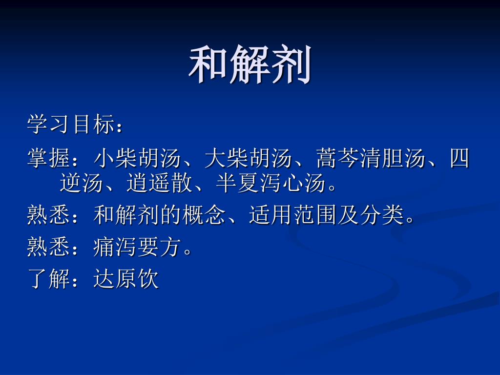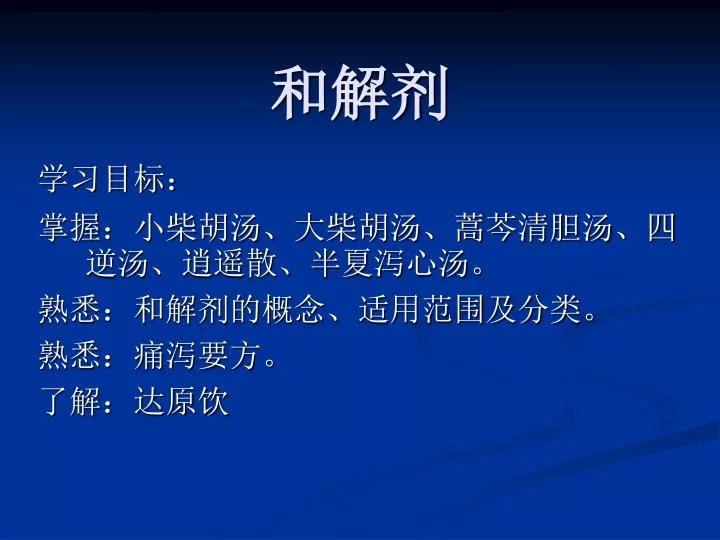 和解剂 学习目标: 掌握:小柴胡汤、大柴胡汤、蒿芩清胆汤、四逆汤、逍遥散、半夏泻心汤。 熟悉:和解剂的概念、适用范围及分类。 熟悉:痛泻要方。 了解:达原饮