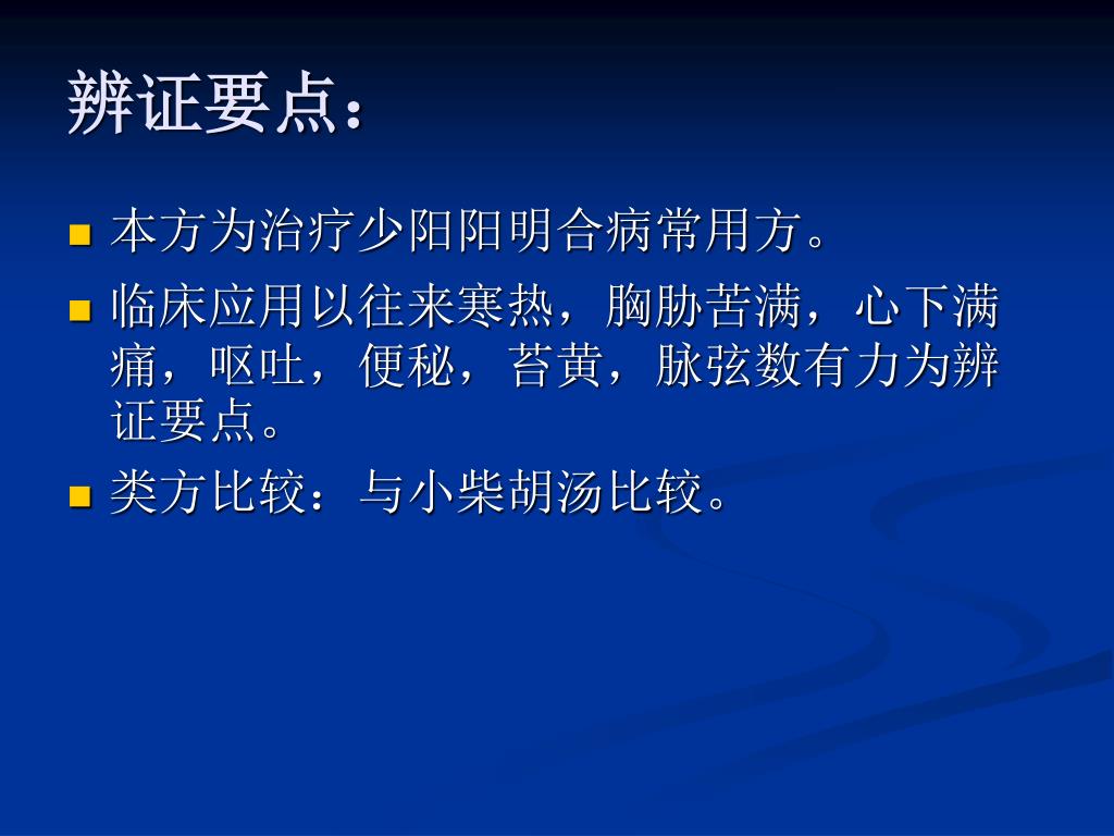 辨证要点: • 本方为治疗少阳阳明合病常用方。 • 临床应用以往来寒热,胸胁苦满,心下满痛,呕吐,便秘,苔黄,脉弦数有力为辨证要点。 • 类方比较:与小柴胡汤比较。