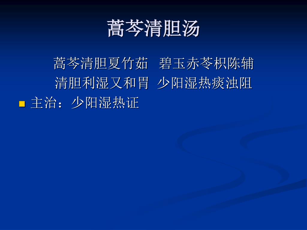 蒿芩清胆汤 蒿芩清胆夏竹茹 碧玉赤苓枳陈辅 清胆利湿又和胃 少阳湿热痰浊阻 • 主治:少阳湿热证