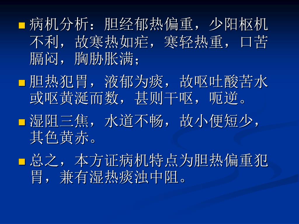 病机分析:胆经郁热偏重,少阳枢机不利,故寒热如疟,寒轻热重,口苦膈闷,胸胁胀满;病机分析:胆经郁热偏重,少阳枢机不利,故寒热如疟,寒轻热重,口苦膈闷,胸胁胀满; • 胆热犯胃,液郁为痰,故呕吐酸苦水或呕黄涎而数,甚则干呕,呃逆。 • 湿阻三焦,水道不畅,故小便短少,其色黄赤。 • 总之,本方证病机特点为胆热偏重犯胃,兼有湿热痰浊中阻。