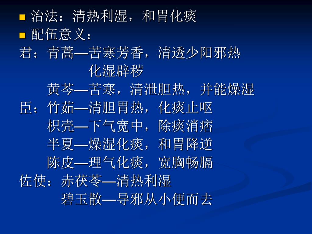 治法:清热利湿,和胃化痰 • 配伍意义: 君:青蒿—苦寒芳香,清透少阳邪热 化湿辟秽 黄芩—苦寒,清泄胆热,并能燥湿 臣:竹茹—清胆胃热,化痰止呕 枳壳—下气宽中,除痰消痞 半夏—燥湿化痰,和胃降逆 陈皮—理气化痰,宽胸畅膈 佐使:赤茯苓—清热利湿 碧玉散—导邪从小便而去