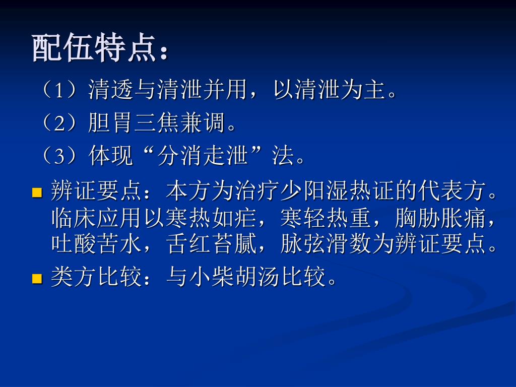 配伍特点: (1)清透与清泄并用,以清泄为主。 (2)胆胃三焦兼调。 (3)体现“分消走泄”法。 • 辨证要点:本方为治疗少阳湿热证的代表方。临床应用以寒热如疟,寒轻热重,胸胁胀痛,吐酸苦水,舌红苔腻,脉弦滑数为辨证要点。 • 类方比较:与小柴胡汤比较。