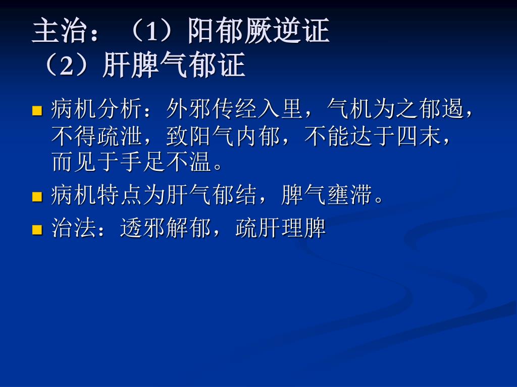 主治:(1)阳郁厥逆证(2)肝脾气郁证 • 病机分析:外邪传经入里,气机为之郁遏,不得疏泄,致阳气内郁,不能达于四末,而见于手足不温。 • 病机特点为肝气郁结,脾气壅滞。 • 治法:透邪解郁,疏肝理脾