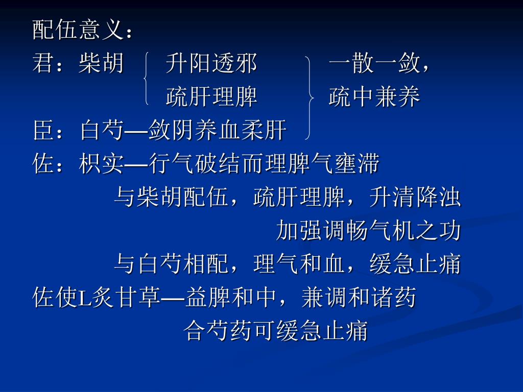 配伍意义: 君:柴胡 升阳透邪 一散一敛, 疏肝理脾 疏中兼养 臣:白芍—敛阴养血柔肝 佐:枳实—行气破结而理脾气壅滞 与柴胡配伍,疏肝理脾,升清降浊 加强调畅气机之功 与白芍相配,理气和血,缓急止痛 佐使L炙甘草—益脾和中,兼调和诸药 合芍药可缓急止痛