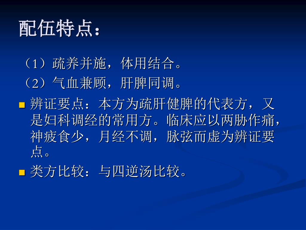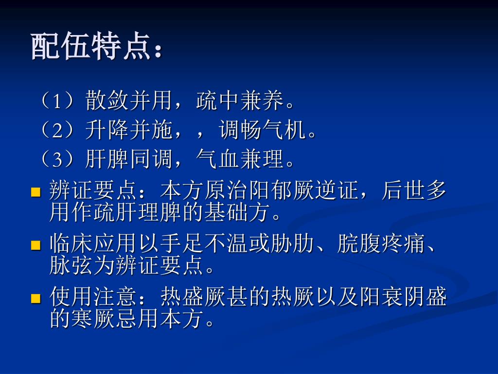 配伍特点: (1)散敛并用,疏中兼养。 (2)升降并施,,调畅气机。 (3)肝脾同调,气血兼理。 • 辨证要点:本方原治阳郁厥逆证,后世多用作疏肝理脾的基础方。 • 临床应用以手足不温或胁肋、脘腹疼痛、脉弦为辨证要点。 • 使用注意:热盛厥甚的热厥以及阳衰阴盛的寒厥忌用本方。