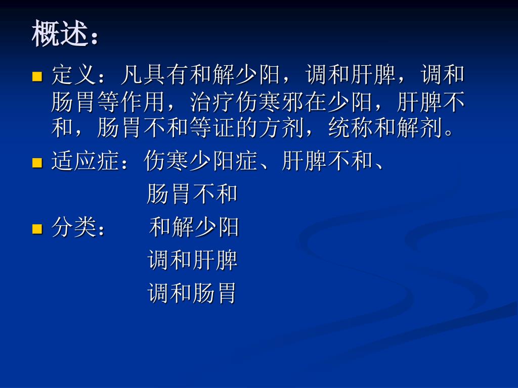 概述: • 定义:凡具有和解少阳,调和肝脾,调和肠胃等作用,治疗伤寒邪在少阳,肝脾不和,肠胃不和等证的方剂,统称和解剂。 • 适应症:伤寒少阳症、肝脾不和、 肠胃不和 • 分类: 和解少阳 调和肝脾 调和肠胃