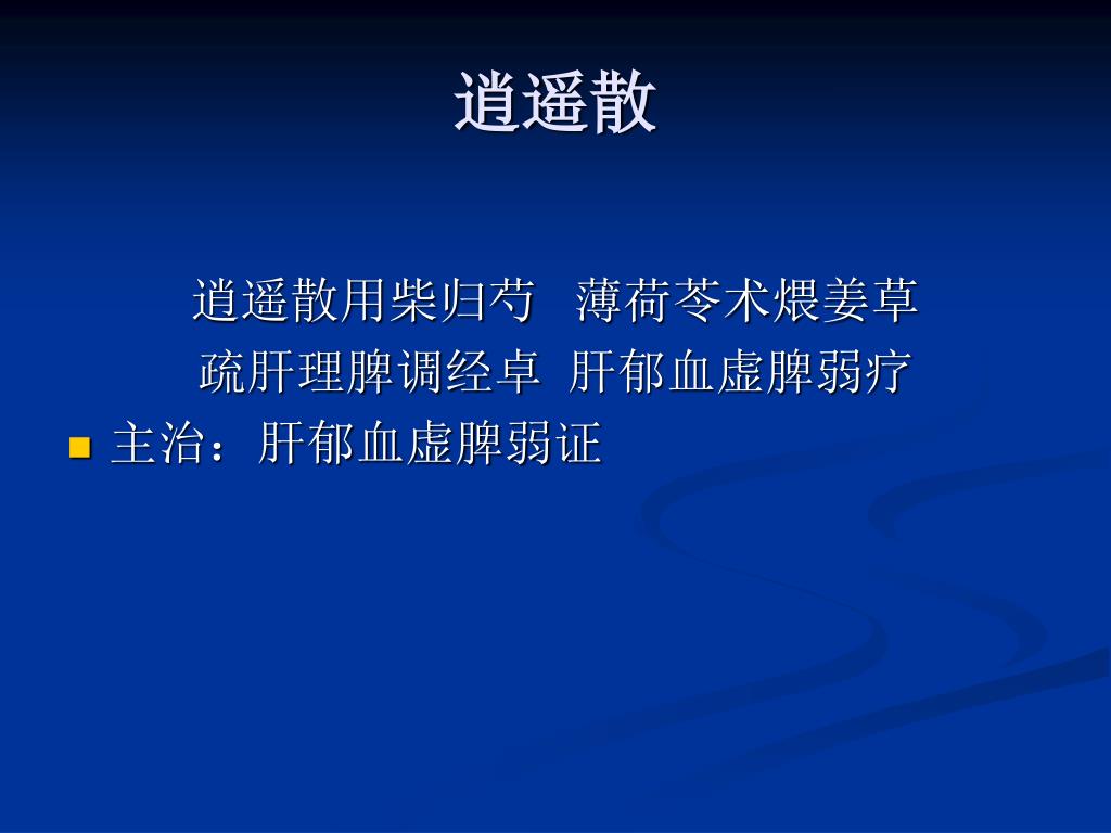 逍遥散 逍遥散用柴归芍 薄荷苓术煨姜草 疏肝理脾调经卓 肝郁血虚脾弱疗 • 主治:肝郁血虚脾弱证